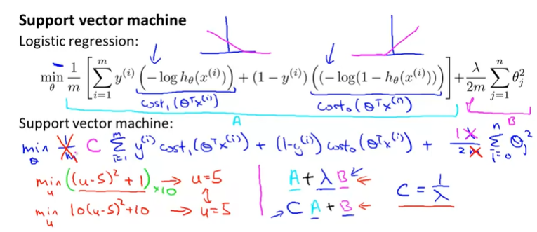 기존 logistic regression의 Cost Function에서 1)Cost최적화에 상관이 없는 Training Example의 개수인 m이 제거되고, 2)새롭게 정의한 cost함수(hinge loss function)을 대입하고, 3)Regularization Parameter \(\lambda\)를 제거하고 첫 번째항에 C라는 parameter를 추가하였다.