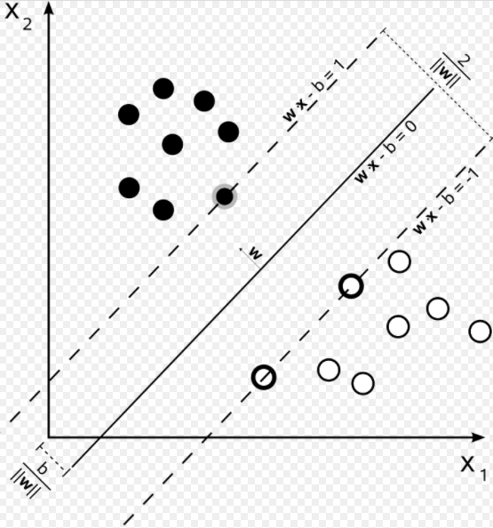 여기서 \(w\)는 parameter \(\theta\)를 의미한다. 여기서 \(w \cdot x - b = 1, w \cdot x - b = 1\)에 해당하는 직선이 support vector이다. Decision Boundary에 해당하는 \(w \cdot x - b = 0\)를 hyperplane(초평면)이라고 하며, Data가 n차원이라면 초평면은 n-1차원이 된다(여기서는 n = 2, 초평면은 1차원).