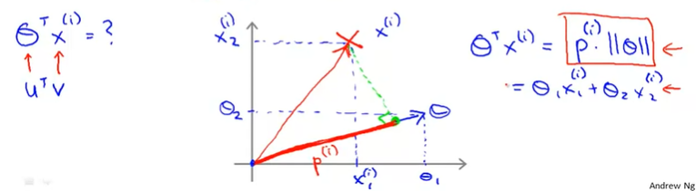\[\theta^Tx^{(i)} = p^{(i)}\cdot\ \left \| \theta \right \| = \theta_1x_1^{(i)} + \theta_2x_2^{(i)}\]