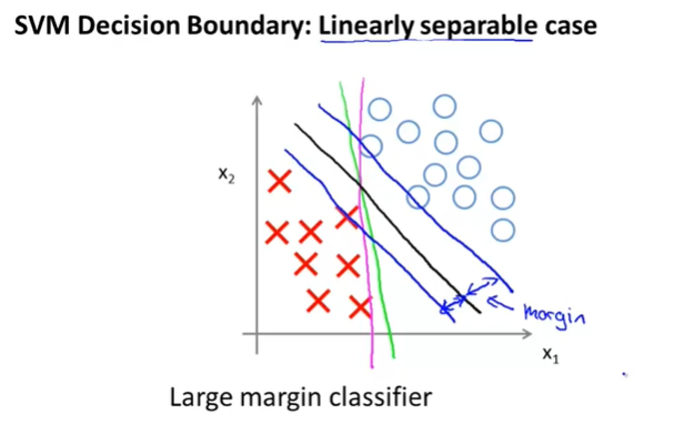 하지만, SVM을 사용하면 검은색 그래프와 같은 Decision Boundary를 찾게될 것이다. 연두색이나 보라색 그래프보다는 훨씬 좋은 Decision Boundary로 보이며, positive/negative examples을 분류하는데 잘 동작할 것이다. 그리고, 검은색 그래프는 Data examples과 더 큰 Distance를 갖게되며, 이 Distance를 SVM의 Margin이라고 한다.
