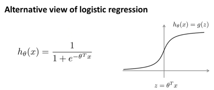 \[h_\theta(x) = \left\{\begin{matrix} 1\text{ }\text{if } \theta^Tx \gg 0 \\ 0\text{ }\text{if } \theta^Tx \ll 0 \end{matrix}\right.\]