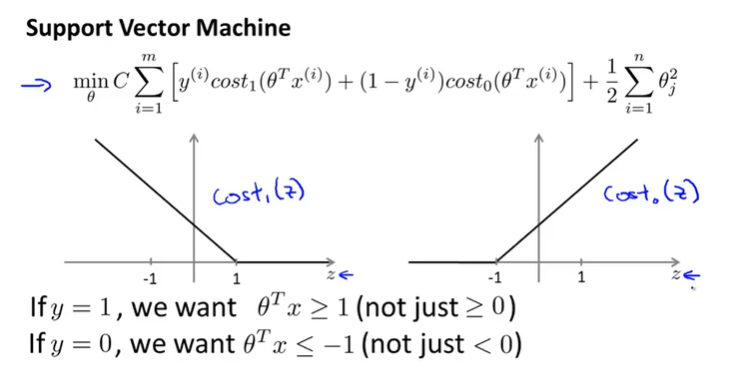 SVM의 Cost Function은 위와 같다. 여기서 z가 1보다 클 때만 \(cost_1(z)\)가 0이고, z가 -1보다 작을 때만 \(cost_0(z)\)가 0이다. Logistic Regression(LR)에서는 0이 기준이었다.