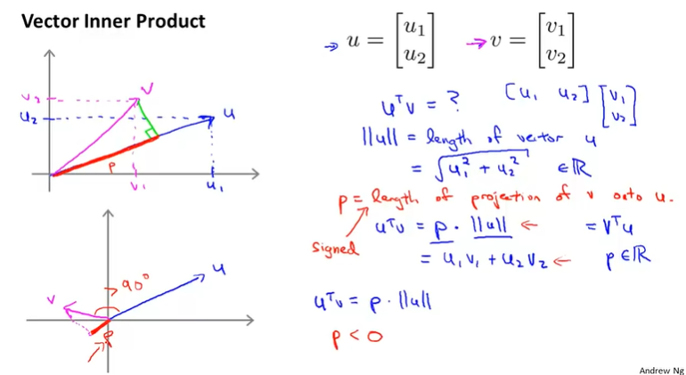 \[\begin{align*} u^Tv &= p\cdot\ \left \| u \right \| \\ &= u_1v_1 + u_2v_2 \end{align*}\]