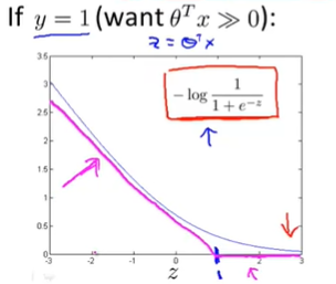 이제, 우리는 SVM에서는 그래프이 보라색 선과 같이 표현할 것이다(log를 사용하지 않고 직선으로 나타낼 것이다). 1을 기준으로 1보다 크다면 flat하며, 1보다 작으면 점점 증가하는 직선으로 그려서, 부분적인 직선(piecewise-linear)으로 나타낼 것이다. 증가하는 직선에서 기울기는 중요하지 않으며, 이렇게 Logistic Regression과 유사한 직선을 새롭게 나타냄으로써 우리는 SVM에서 계산상의 이점을 갖게되고, 나중에 문제를 더 쉽게 최적화할 수 있을 것이다.