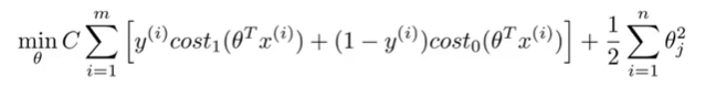 따라서 Logistic Regression의 Cost Function에서 새롭게 정의한 \(cost_1(z), cost_0(z)\)를 대입해서 새롭게 SVM Cost Function을 정의한다.