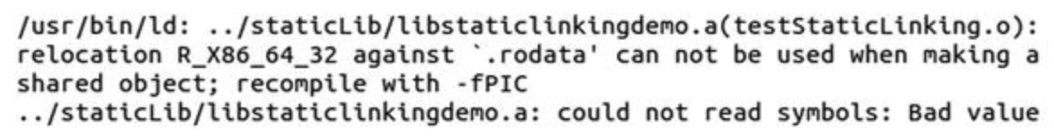 하지만, 동적 라이브러리에 링크된 정적 라이브러리는 -fPIC 플래그로 컴파일해야 합니다 (또는 -fPIC 대신 -mcmodel=large 플래그를 사용할 수도 있습니다). 정적 라이브러리가 두 플래그 중 하나로 컴파일되지 않고 동적 라이브러리에 링크하려고 하면, 다음과 같이 링커 에러가 발생합니다.