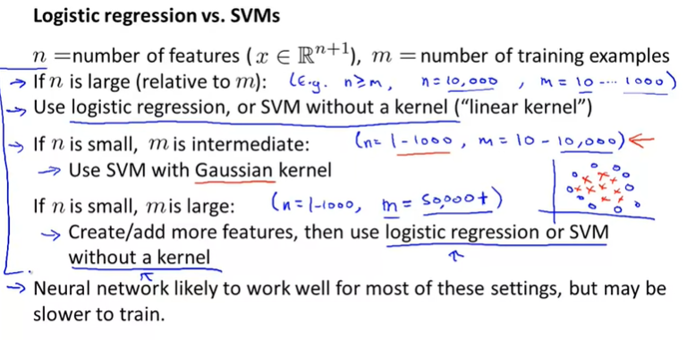 - feature n이 작고, training example m이 중간 정도라면, 예를 들어서 n = 1 ~ 1000, m = 10 ~ 10000이라면