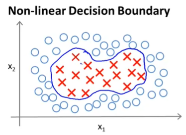 \[\begin{align*}\text{Predict } y = 1 \text{ if } \\ &\theta_0 + \theta_1x_1 + \theta_2x_2 + \theta_3x_1x_2 \\ &+ \theta_4x_1^2 + \theta_5x_2^2 + \cdots \leq 0 \end{align*}\]