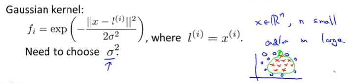 feature n이 작고, training example m이 많아서 좀 더 복잡한 non-linear decision boundary가 필요할 때 가우시안 커널을 사용하는 것은 좋은 선택이 될 수 있다. 강의 마지막에 어떻게 커널을 선택할 수 있는가에 대해서 조금 더 설명하겠다.