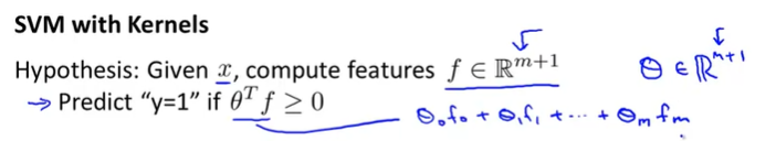 \(x^{(i)} \in \mathbb{R}^{(n)}\)(or \(\mathbb{R}^{(n+1)}\))인 feature \(x\)에서 m개의 training example을 landmark로 두고 새로운 feature \(f^{(i)}\)( \(\in \mathbb{R}^{(m)}\) or \(\mathbb{R}^{(m + 1)}\)) vector를 구하는 것이다. \(f_0^{(i)}\)를 추가하면 m+1차원이고, 추가하지 않으면 m 차원이다. \(f\)(m+1 차원)는 다음과 같다.