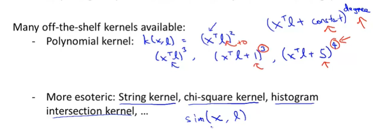 잘 사용되지는 않지만, 다른 사람들이 이것을 사용하는 것을 볼 수도 있다. 위의 similarity function은 polynomail kernel의 한 예시이며, 다른 similarity function을 사용하는 것도 있다.(e.g. \((X^Tl)^3, (X^Tl + 1)^3, (X^Tl + S)^4 \rightarrow (X^Tl + constant)^{degree}\)(general form))