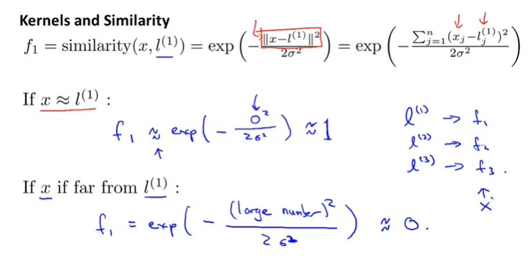 \[\begin{matrix} f_1 = similarity(x, l^{(1)}) & = exp(-\frac{\left\| x - l^{(1)} \right\|^2}{2\sigma^2}) \\ f_2 = similarity(x, l^{(2)}) & = exp(-\frac{\left\| x - l^{(2)} \right\|^2}{2\sigma^2}) \\ f_3 = similarity(x, l^{(3)}) & = exp(-\frac{\left\| x - l^{(3)} \right\|^2}{2\sigma^2}) \end{matrix}\]
