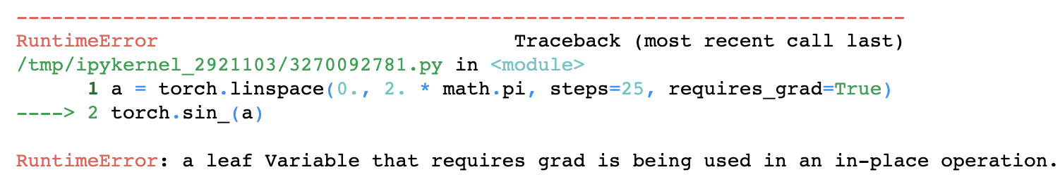 지금까지 모든 예제에서 연산을 수행할 때 중간 값을 다른 변수에 저장하여 캡처하였습니다. 이처럼 autograd는 gradients를 계산하기 위해서 이와 같은 중간 값이 필요합니다. 이러한 이유로 autograd를 사용할 때는 in-place operations 사용에 주의해야 합니다. 만약 in-place 연산을 사용하면 backward()를 호출하여 도함수를 계산하는데 필요한 정보가 손상될 수 있습니다. 파이토치에서는 autograd가 활성화된 리프 변수에 대해 in-place 연산을 수행할 때, 아래와 같이 작업을 중단시킵니다.