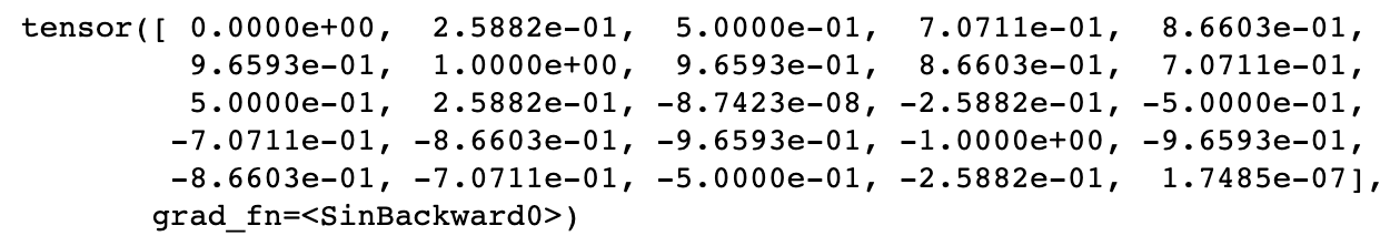 grad_fn은 우리가 backpropagation step과 gradients를 계산할 때, 이 텐서의 모든 입력에 대해 sin(x)의 도함수를 계산해야한다는 힌트를 제공합니다.