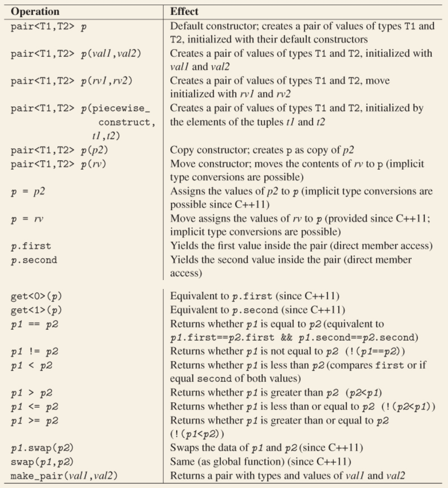 pair 구조는 <utility>에 정의되어 있으며 아래의 연산들을 제공합니다. 원칙적으로 생성한 뒤, 복사/할당/교환 그리고 비교할 수 있습니다. 또한, 첫 번째와 두 번째 값의 데이터 타입을 나타내는 first_type, second_type이라는 데이터 타입 정의도 같이 제공하고 있습니다.