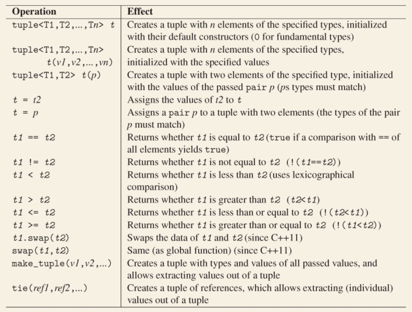 TR1에서는 요소의 수가 제한되었지만, 임의의 수의 요소를 가질 수 있도록 pair의 개념을 확장한 tuple 클래스를 도입했습니다. 여기서는 최대 10개의 다른 타입의 요소를 가질 수 있는 tuple이 구현되었습니다.