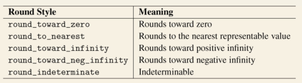 반올림 스타일은 rount_style 멤버를 통해 제공되며, 가질 수 있는 값은 아래와 같습니다.