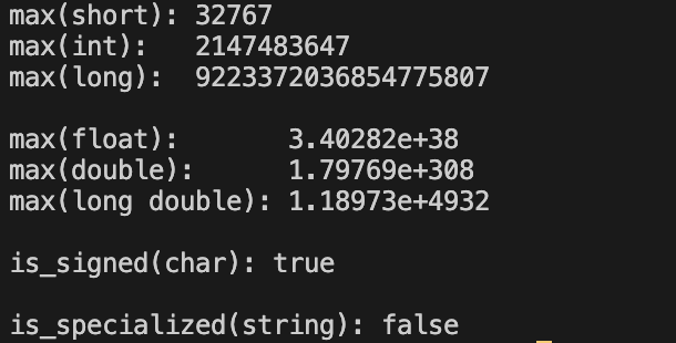 여기서 is_specialized는 true로 설정되고, 다른 모든 멤버들은 특정 데이터 타입에 대한 numeric limits의 값을 갖습니다.