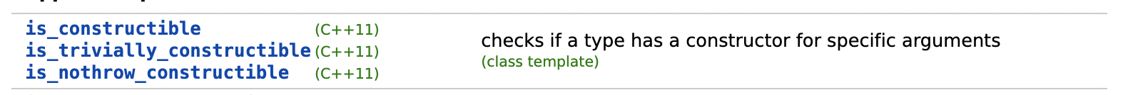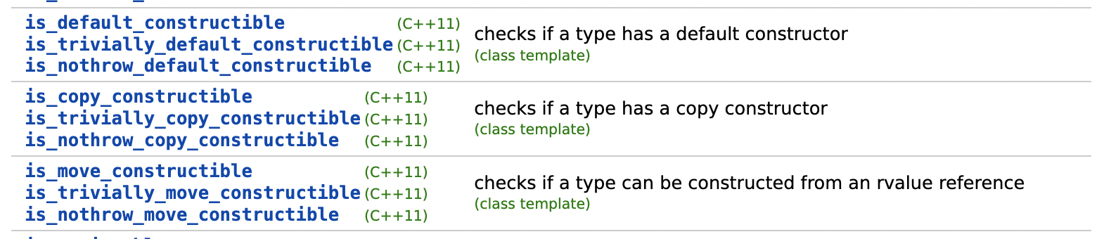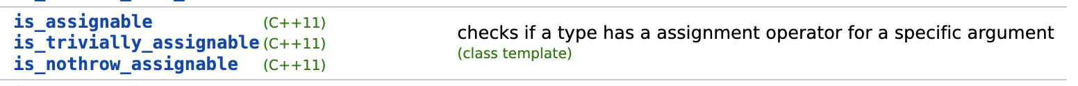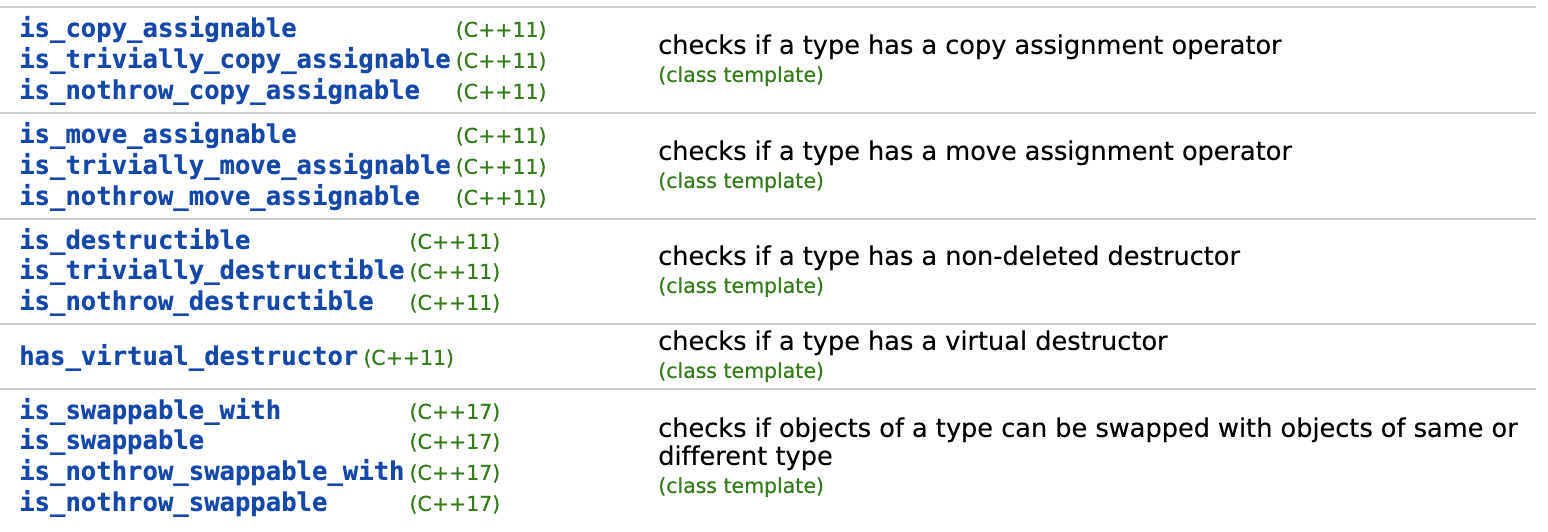 아래는 데이터 타입 간의 관계를 검사할 때 사용할 수 있는 type traits 입니다. 여기에는 해당 클래스에서 어떤 생성자와 할당 연산자가 제공되는지 검사하는 부분도 포함되어 있습니다.