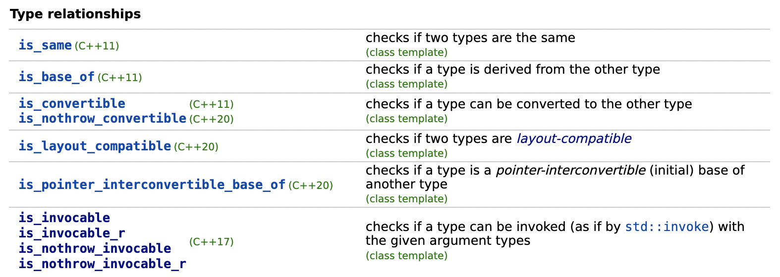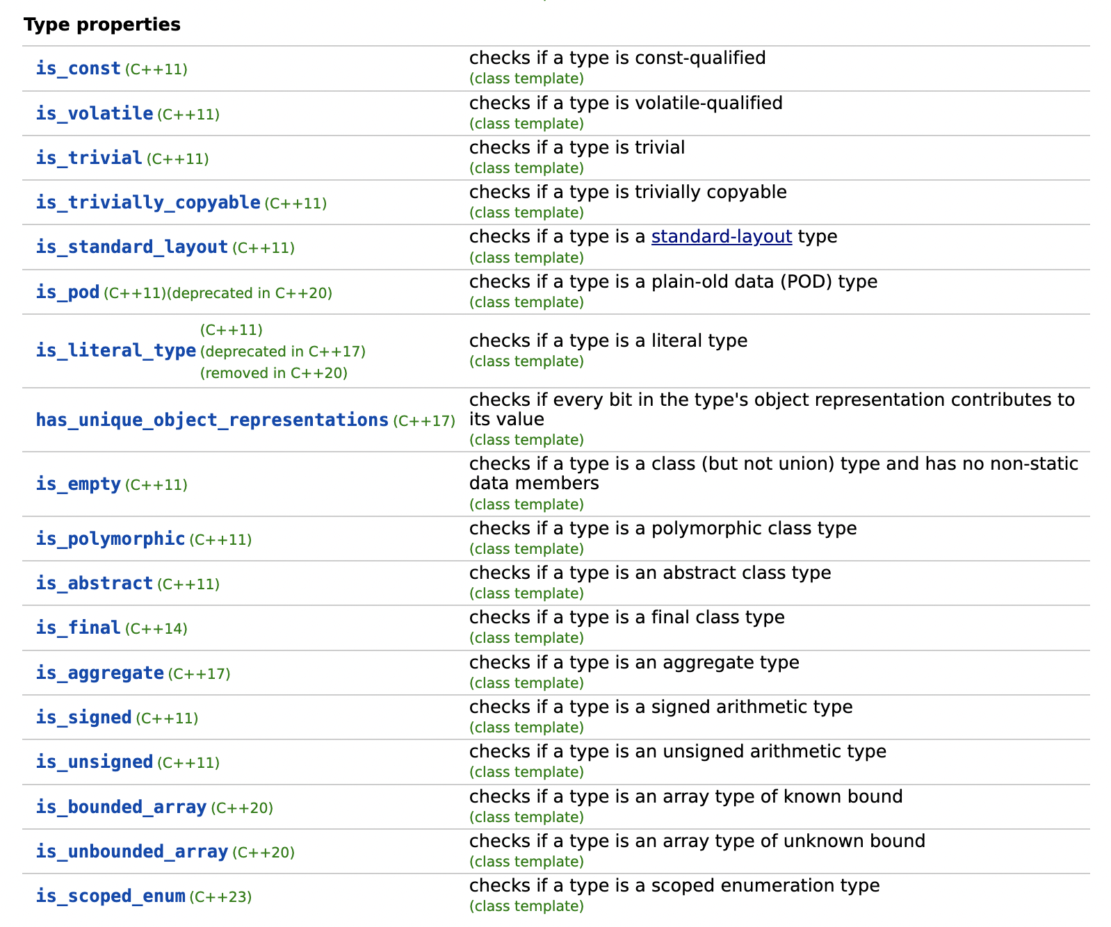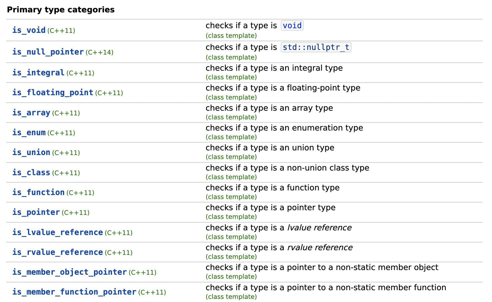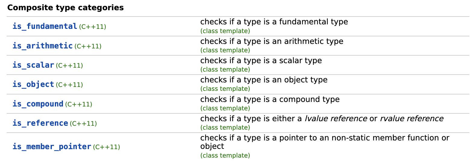 데이터 타입에 대해 제공되는 type predicates는 아래와 같습니다. cppreference에서 캡처한 정보입니다.