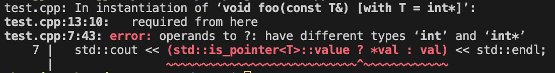 여기서 <type_traits>에 정의된 std::is_pointer trait를 사용하여 타입 T가 포인터 타입인지 체크합니다. 사실 is_pointer<>는 ::value가 true이거나 false인 true_type 또는 false_type이라는 데이터 타입을 반환합니다. 만약 전달된 파라미터 val이 포인터라면 foo() 함수는 아래와 같이 출력합니다.