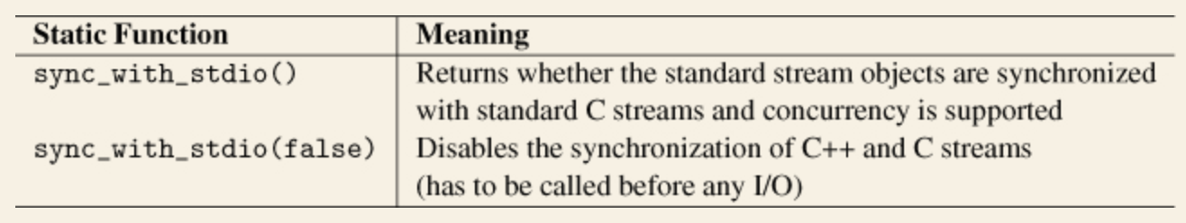 구현에 따라 이 동기화에 필요하지 않은 부하가 발생합니다. 예를 들어, 표준 C 파일을 사용해 표준 C++ 표준 스트림을 구현한다면 스트림 버퍼 쪽에서 버퍼를 해야 합니다. 그러나 스트림 버퍼의 버퍼는 몇몇 최적화가 필요한데, 특히, formatted reading을 위해서 최적화가 필요합니다. 더 나은 구현으로 스위칭하기 위해서 ios_base 클래스에 static 멤버 함수로 sync_with_stdio()가 제공됩니다.
