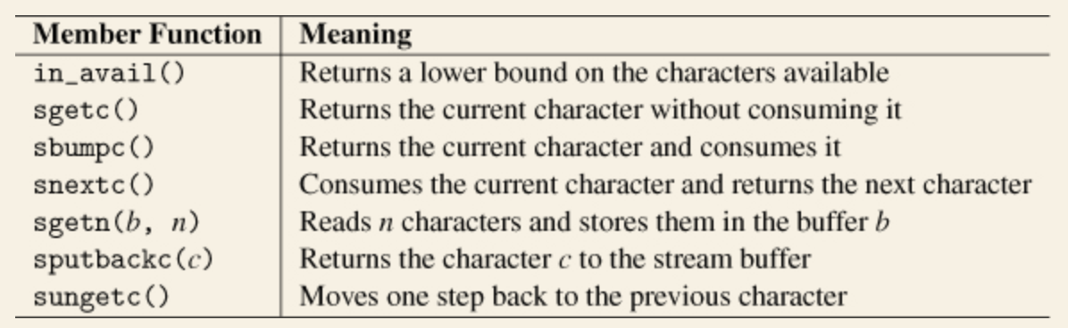 입력 스트림 버퍼는 출력처럼 하나의 함수를 오버라이딩하는 것만으로는 충분하지 않습니다. 버퍼를 설정하든지, 아니면 최소한 underflow()와 uflow()를 구현해야 합니다. underflow()는 다음 문자로 넘어가지는 않지만 sgetc()에서 호출될 수 있기 때문입니다. 다음 문자로 이동하는 것은 버퍼를 조작하거나 uflow() 호출해야 합니다. 어떤 경우에서든 underflow()는 문자를 읽을 수 있는 스트림 버퍼에 대해서 구현을 해야 합니다. 만약 underflow()와 uflow()를 모두 구현한다면, 버퍼를 설정할 필요는 없습니다.
