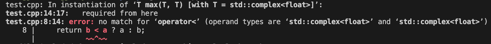 함수 템플릿 내에서 사용된 연산을 지원하지 않는 타입에 대해 템플릿을 인스턴스화하면 컴파일 에러가 발생합니다. 아래의 예제 코드를 살펴봅시다.