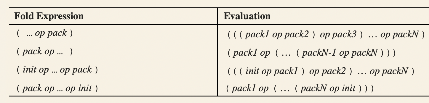 확장되지 않은 표현식 패턴 pack과 패턴이 아닌 표현식 value가 주어졌을 때, C++17에서는 임의의 연산자 op에 대해 다음과 같이 연산자를 오른쪽으로 폴드(binary right fold) 하거나