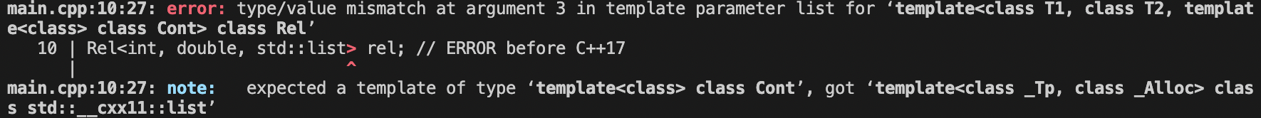 위 예제 코드에서 두 번째 선언을 보면 기본 호출 인자가 템플릿 파라미터에 종속될 수 있음을 알 수 있습니다. 두 번째 선언은 다음과 같이 정의할 수도 있습니다 (C++11 이전에서는 아래의 방법만 가능).