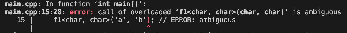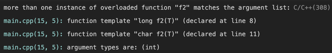 그러나 위 템플릿들을 인스턴스화하면 오버로딩이 모호해지기 때문에 같은 스코프에서 선언되었을 때는 항상 사용할 수는 없습니다. 예를 들어, 위와 같이 템플릿이 선언되어 있을 때 f2(42)를 호출하면 어떤 함수를 사용할 지 모호합니다.