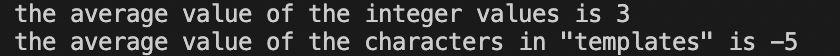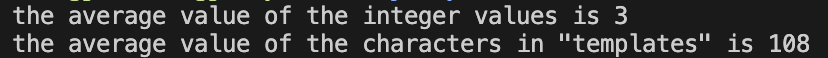그 뒤, templates라는 단어의 모든 문자를 더하고 평균을 구합니다. 펑균은 a(97)와 z(122)의 값 사이에 있을 것이라고 예상할 수 있지만 실행했을 때의 결과값은 다음과 같습니다.