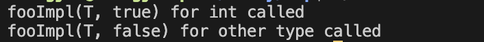std::cout << "fooImpl(T, true) for int called\n";