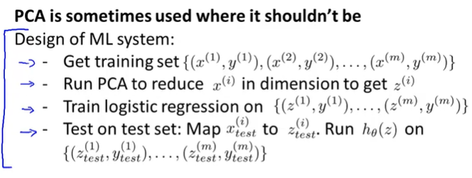 이 때, 우리는 PCA를 사용해서 위와 같이 feature의 차원을 1000으로 축소하면 학습 알고리즘의 속도는 훨씬 빨라질 것이다. \(x\)에 대해서 \(U_{reduce}\)를 사용해서 \(z\)의 새로운 feature를 얻는다.