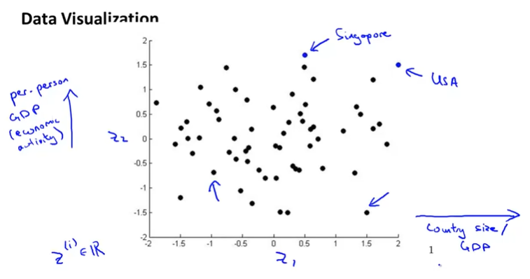여기서는 \(x^{(i)} \in \mathbb{R}^{50}\)에서 \(z^{(i)} \in \mathbb{R}^2\)로 차원을 축소하였다. 이렇게 차원을 축소하면 아래 그래프와 같이 시각적으로 쉽게 표현되며, 우리는 기존 feature를 효과적으로 요약해주는 새로운 feature \(z_1, z_2, z_3\)를 찾으면 된다.