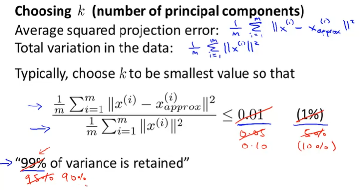 \(\begin{matrix} \frac{\frac{1}{m}\sum_{i = 1}^{m}\left\| x^{(i)} - x_{approx}^{(i)}\right\|^2}{\frac{1}{m}\sum_{i = 1}^{m}\left\|x^{(I)}\right\|^2} \leq 0.01 & (1\%) \end{matrix}\)
