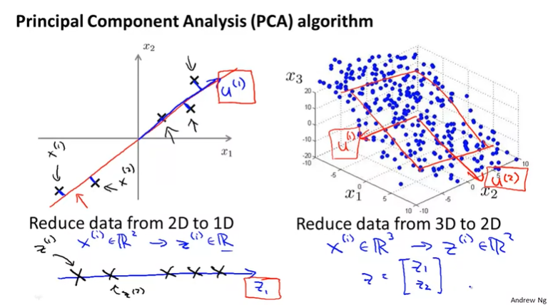 PCA 알고리즘에서 우리는 벡터 \(u^{(i)}\)와 새로운 feature \(z^{(i)}\) 구해야 한다.