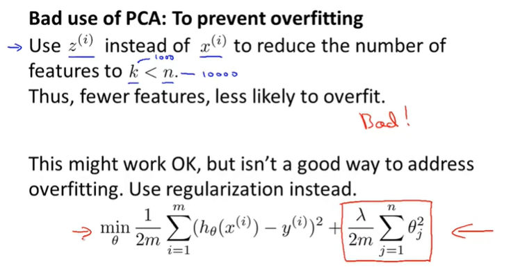 PCA를 사용하면 feature dimension이 줄어들기 때문에 overfitting을 피하는데에도 사용할 수 있을 것 같지만, overfitting 문제를 해결하려고 PCA를 사용하는 것은 좋지 않다. PCA는 정보의 양을 감소시키고, 특히 예측값에 상관없이 차원을 축소하기 때문에 꼭 필요한 정보를 잃을 수도 있다.