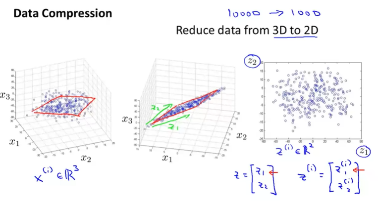 3차원에서 2차원으로 감소하는 것은 위와 같다. feature \(x_1, x_2, x_3\)을 2차원의 평면에 투영해서 feature \(z_1, z_2\)로 감소하였다.