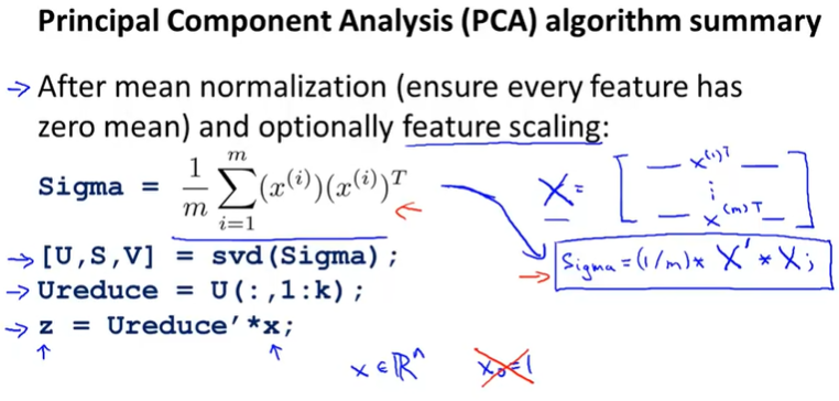 \[\Sigma = \frac{1}{m}\sum_{i = 1}{n}(x^{(i)})(x^{(i)})^T\]