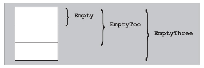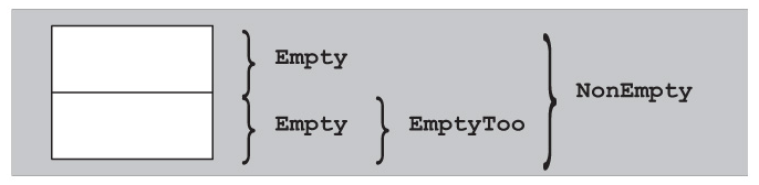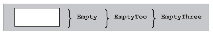 위 코드에서 NonEmpty는 empty 클래스가 아니라는 것을 보여준다. 이 클래스는 base 클래스 이외에 다른 멤버를 갖지 않지만, base 클래스인 Empty와 EmptyToo에 같은 주소를 할당할 수 없다. 같은 주소를 할당한다면 EmptyToo의 base 클래스(Empty)와 NonEmpty의 base 클래스(Empty)가 결과적으로 같은 주소를 갖게 되기 때문이다. 즉, 동일한 타입의 두 하위 객체가 결과적으로 동일한 offset에 위치하게 되며, 이는 C++의 object layout rules에서 허용되지 않는다. NonEmpty 클래스의 Base 클래스인 Empty 클래스 중 하나는 offset 0 바이트, 다른 하나는 offset 1 바이트에 배치되도록 결정하는 것이 가능하지만 전체 NonEmpty 객체는 아래 1 바이트의 크기를 가질 수 없다 (아래 그림 참조).