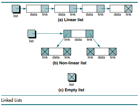 Linear list는 단순히 하나의 link가 있어서 다음 요소를 가리키고 있으며 마지막 요소는 아무것도 가리키고 있지 않습니다. Non-linear list는 한 개 이상의 link가 있으며, link가 하나인 연결리스트를 단일 연결리스트(singly linked list)라고 하며, link가 두개인 연결리스트를 이중 연결리스트(doubly linked list)라고 합니다.