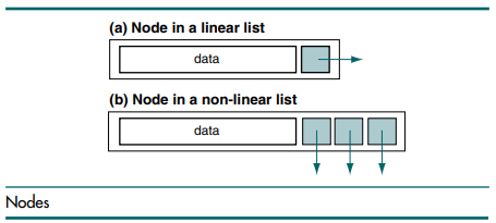연결리스트 구현에서 리스트의 각 요소는 노드(node)라고 불립니다. 노드는 데이터와 하나 혹은 하나 이상의 link가 존재합니다. 아래 그림은 두 종류의 노드를 보여주고 있으며, 하나는 linear list의 노드이고 다른 하나는 non-linear list의 노드입니다.