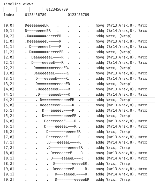 가로축은 사이클 단위의 시간이며, llvm-mca는 마킹된 코드(START와 END 사이의 코드 조각)를 10회 반복 실행하는 것으로 시뮬레이션한다. 각 명령어는 코드의 일련 번호와 몇 번째 반복인지를 나타내는 인덱스로 식별되는데, 첫 번째 반복의 첫 번째 명령어는 [0,0]이며 마지막 명령어는 [9,2]이다. 즉, 코드 조각으로부터 생성된 기계어가 반복 당 3개의 명령어라는 것을 알 수 있다. 위 타임라인 결과에 따르면 전체 시퀀스는 30 사이클이 걸린다.