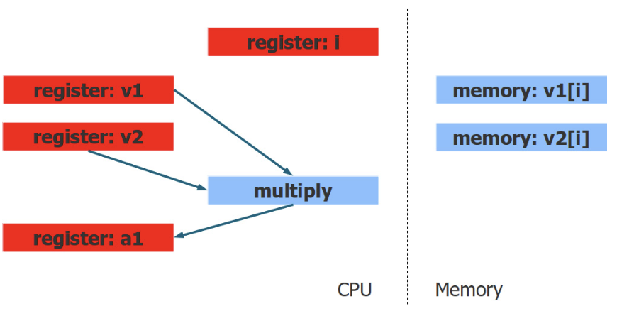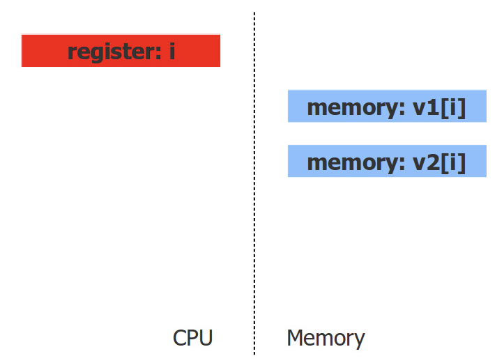 코드의 성능을 분석하려면 프로세서가 코드를 보는 방식을 이해해야 하는데, 코드에서는 단순 덧셈보다 더 많은 것들이 발생한다. 두 입력 배열의 값은 메모리에 저장되어 있지만, 덧셈이나 곱셈 연산은 레지스터에 저장된 값 사이에서 수행된다. 일부 연산의 경우에는 레지스터와 메모리 사이에서 수행되기도 한다. 그럼 이제 루프의 반복이 어떻게 수행되는지 단계별로 살펴보자. 루프의 반복이 시작될 때 인덱스 변수 i는 CPU 레지스터에 있고, 배열 요소 v1[i] 및 v2[i]는 메모리에 위치하게 된다.