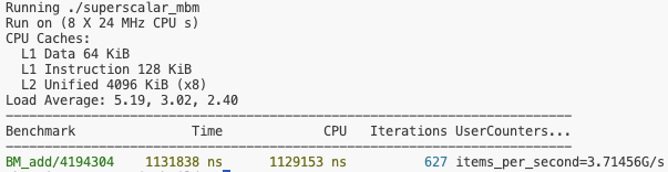 프로세서가 한 번에 실행할 수 있는 명령어의 수는 CPU와 어떤 명령을 수행하는지에 따라 다르다. 하지만, 아래와 같이 많은 명령어들을 수행하는 벤치마크의 경우에는 단일 덧셈을 수행하는 벤치마크의 성능보다 눈에 띄게 느려진 것을 확인할 수 있다.