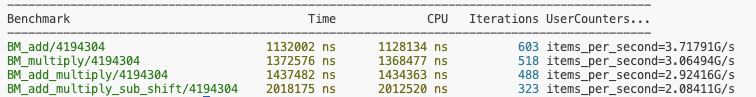 이 벤치마크를 실행한 결과는 다음과 같다. 4194304개의 요소에 대한 벡터합 연산이 약 0.113 ms로 측정되었다. 하나의 덧셈 결과를 계산하는데 약 0.27ns가 걸리는 것으로 계산된다.