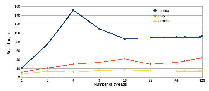 참고 문헌에서의 결과는 아래와 같이 리포트하고 있으며, mutex의 성능이 압도적으로 좋지 않다는 것으로 보여준다. 결과는 하드웨어에 따라서 조금씩 다른 것으로 보인다.