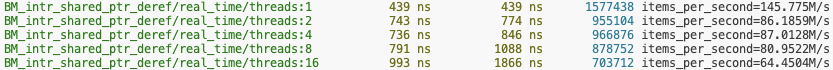 여기서는 역참조의 성능만 측정했지만, 포인터 할당 및 재할당, 아토믹 교환 등 기타 아토믹 연산에도 마찬가지로 효율적이다. 하지만 unique_ptr 보다는 덜 효율적이므로 레퍼런스 카운트없이 명시적으로 소유권을 관리할 수 있다면 이를 피하는 것이 좋다.