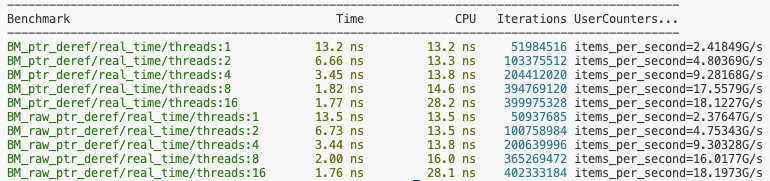 구현이 생각보다 길긴 하지만, 기본적인 기능만 포함하고 있다. 이렇게 구현하면 명시적인 아토믹 연산을 사용하는 것보다 더 효율적이고 빠르게 역참조를 수행할 수 있다. 성능 결과는 다음과 같다.